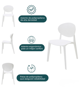 La durabilidad es un pilar fundamental en cualquier silla hogar. La Amassa está inyectada en una sola pieza, lo que garantiza una estabilidad estructural que supera a los muebles ensamblados tradicionalmente. Para complementar esta robustez, incluye topes de goma antideslizantes. Estos detalles aseguran que se mantenga firme en cualquier tipo de piso, evitando ruidos molestos y protegiendo las superficies de posibles rayaduras.